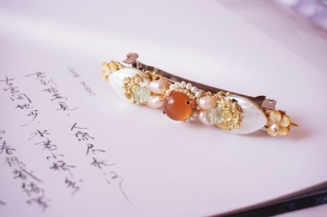 貝產(chǎn)珍珠,珍珠飾貝,如此,便有了這精美雅致的杰作,請欣賞匠心啟航閱讀小編為你帶來的白蝶貝殼雕花珍珠發(fā)夾?!?/p>
